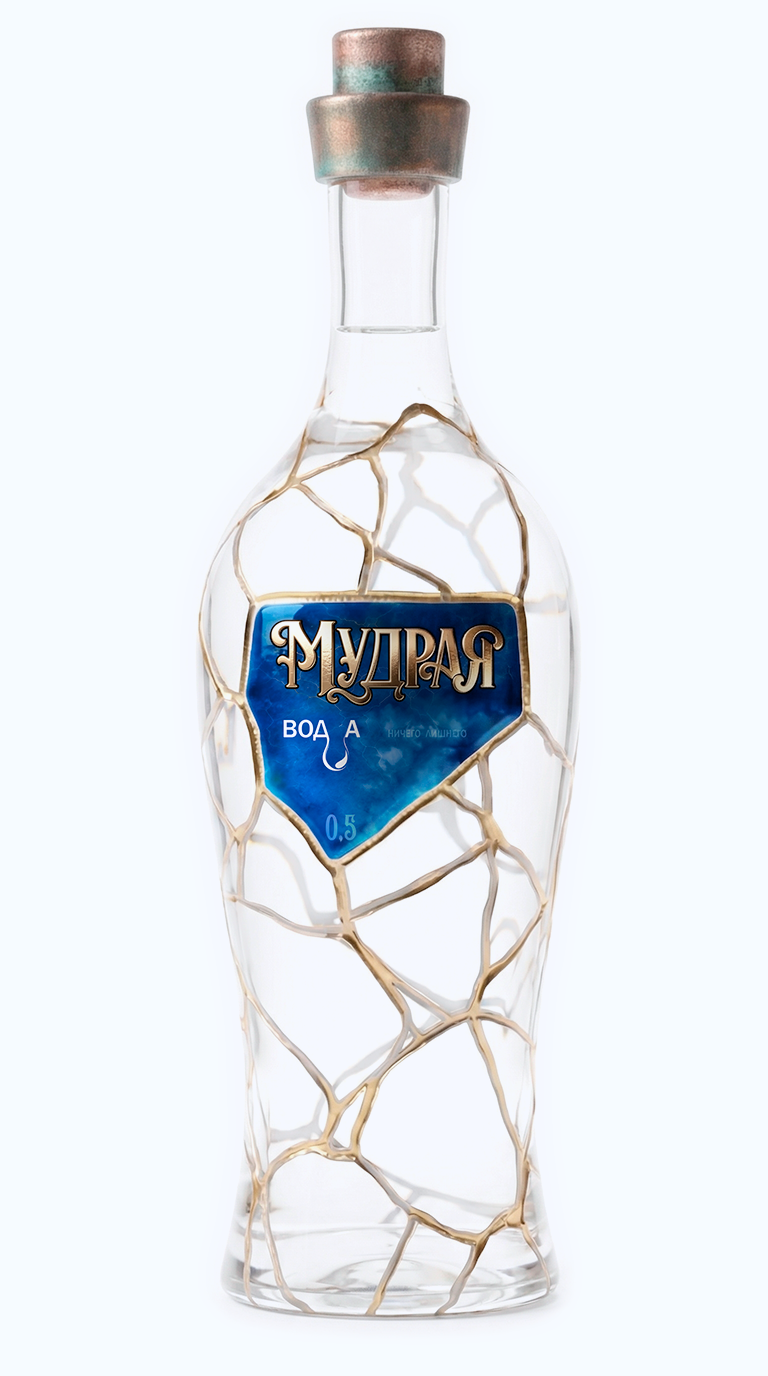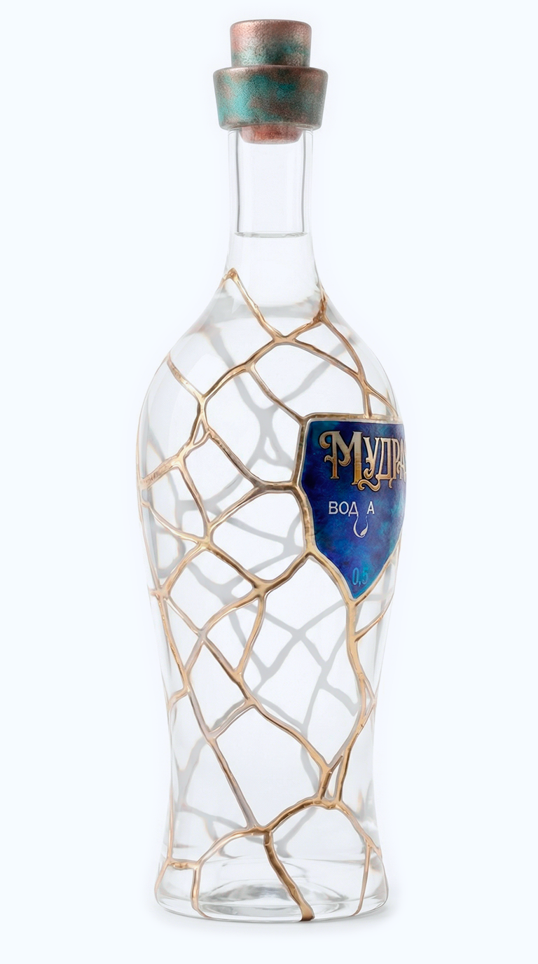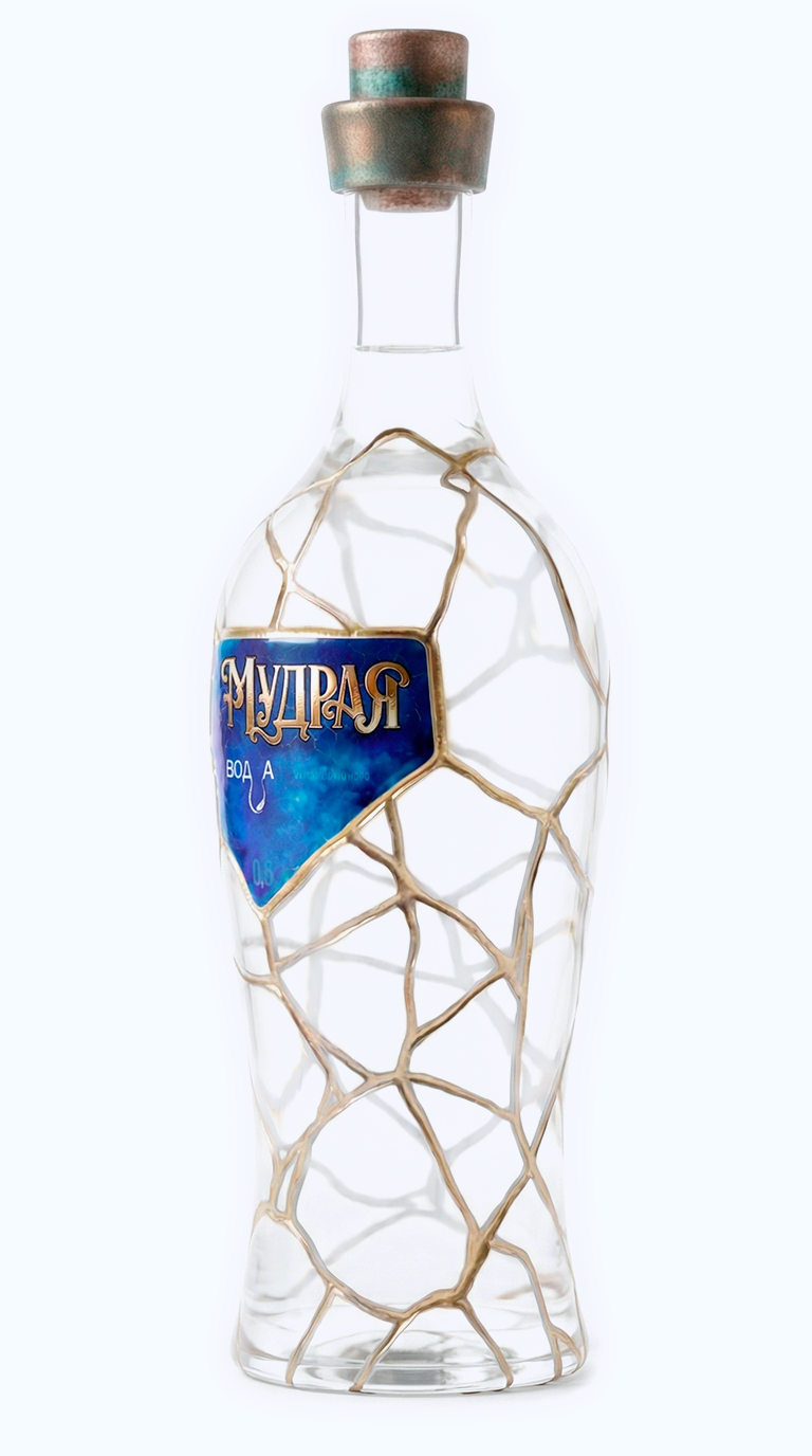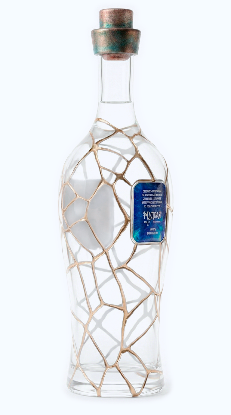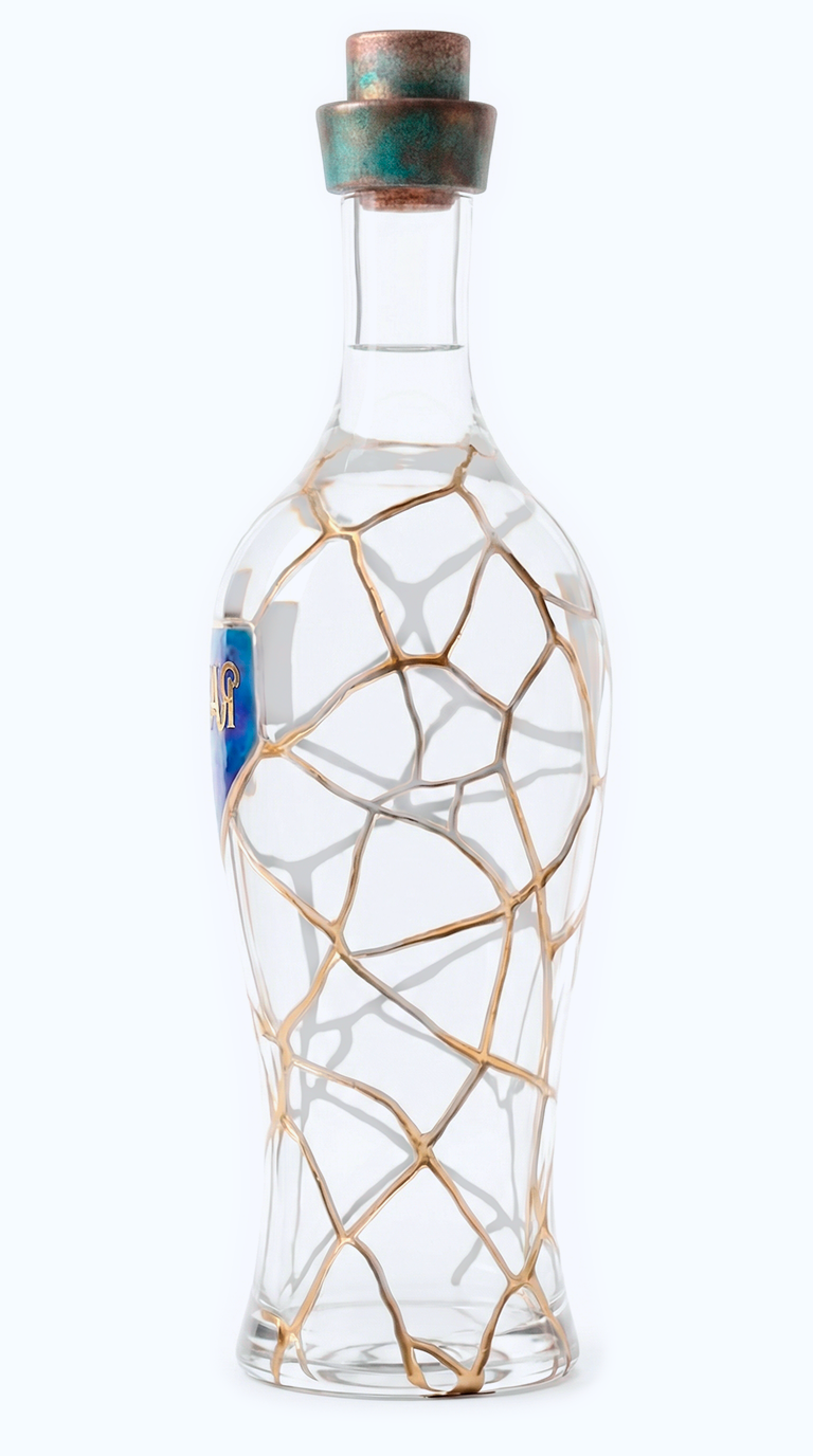 Прикоснитесь взглядом к этому рельефу. Кристальная прозрачность чистого стекла амфоры, глубокие траншеи золотых швов и пронзительные сапфиры, интегрированные прямо в геометрию разломов. Глубокий, холодный блеск лазурита на этикетках контрастирует с горячим сиянием металла, создавая идеальный баланс, сквозь который проступает абсолютная чистота самого напитка.