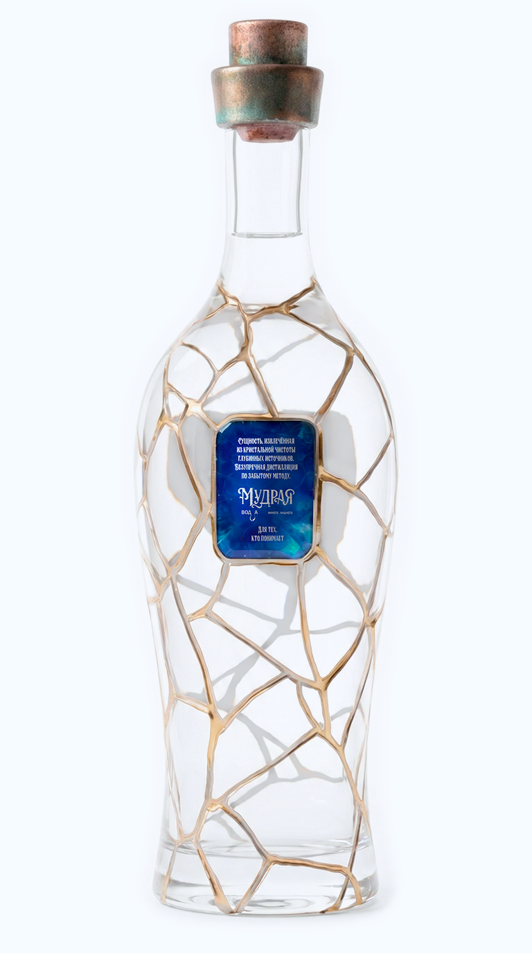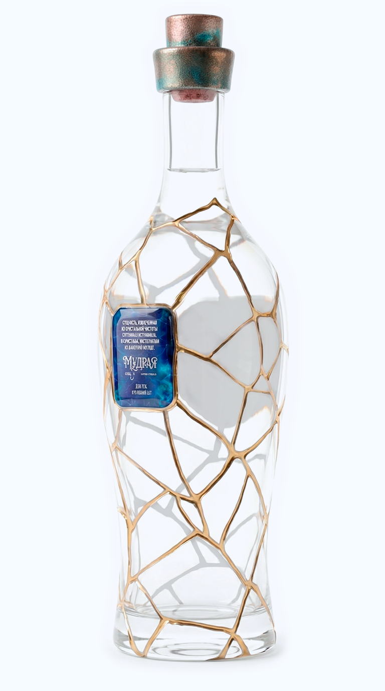 Прикоснитесь взглядом к этому рельефу. Кристальная прозрачность чистого стекла амфоры, глубокие траншеи золотых швов и пронзительные сапфиры, интегрированные прямо в геометрию разломов. Глубокий, холодный блеск лазурита на этикетках контрастирует с горячим сиянием металла, создавая идеальный баланс, сквозь который проступает абсолютная чистота самого напитка.
